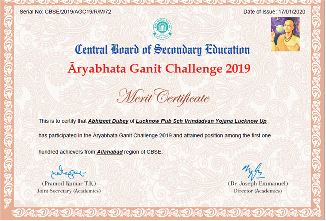Abhizeet Dubey  of Lucknow Public School, score 72 position in Aryabhata Ganit Challenge 2019
