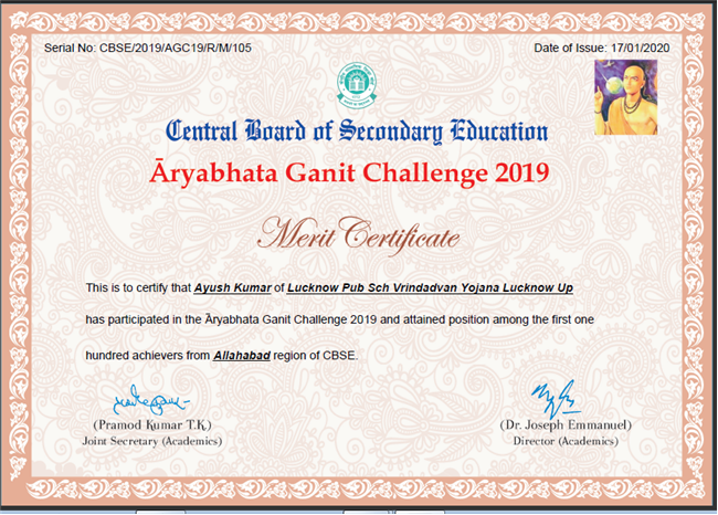 Ayush Kumar  of Lucknow Public School, score 105 position in Aryabhata Ganit Challenge 2019