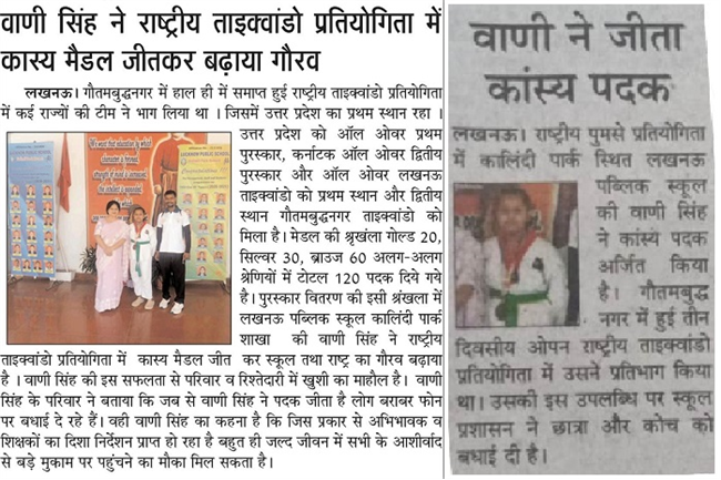 Vani Singh of class 4B won bronze medal at Saheed Vijay Singh sport complex, Noida, UP.