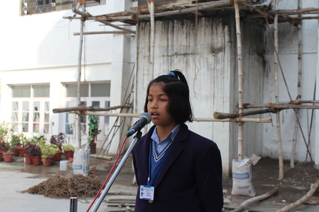 Shhlok Competition was held in our school on 15th of February, 2016, student of classes 5th to 9th took part in reciting the shhloks they prepared on Goddess Saraswati and in presence of all the students participant showed their their courage and accesibility to knowledge. Our music teacher Mr.Rajeev Thapa also recited a poem and sung a song relating Goddess Saraswati.